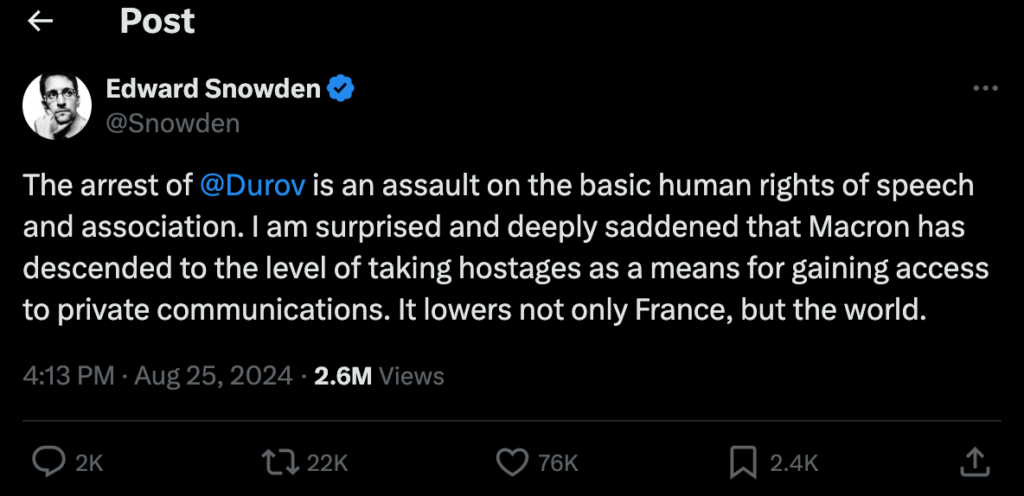 Snowden’s reaction was more direct, condemning the arrest as an assault on fundamental human rights, particularly freedom of speech and association. He criticized the French government’s actions under President Macron, suggesting that such an arrest for the purpose of gaining access to private communications sets a dangerous precedent. Snowden also made a satirical reference to a poem about the gradual erosion of rights, implying that inaction against such arrests could lead to broader suppression of dissent.