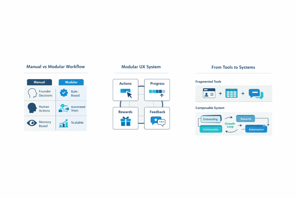 Composable systems allow onboarding, rewards, automation, and community to evolve independently — without breaking the product.