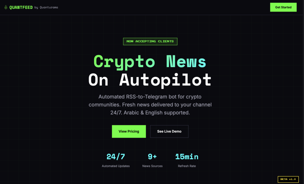 QuantFeed is an automated RSS-to-Telegram bot that monitors top crypto news sources and posts directly to your channel.